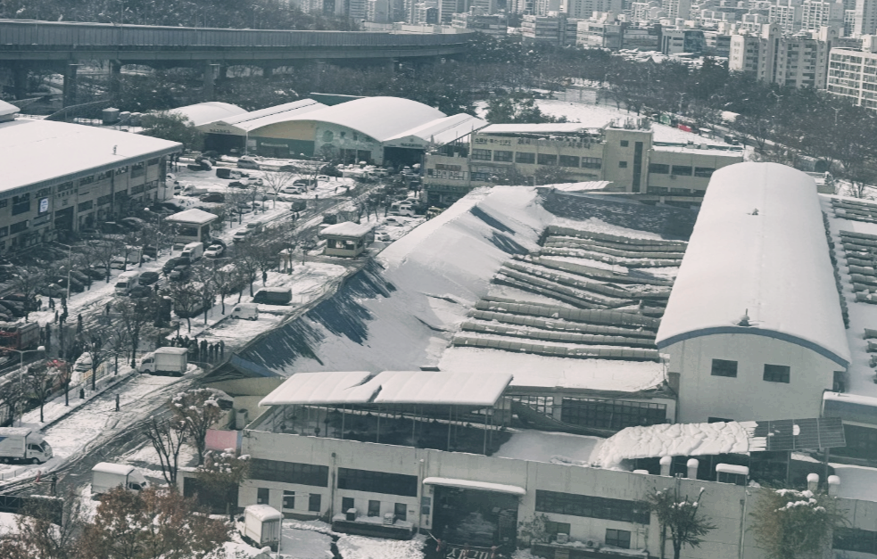 이번 눈으로 인해 28일 오후 12시 6분경 평촌 농수산물시장의 청과동의 지붕도 붕괴되었다고 합니다.